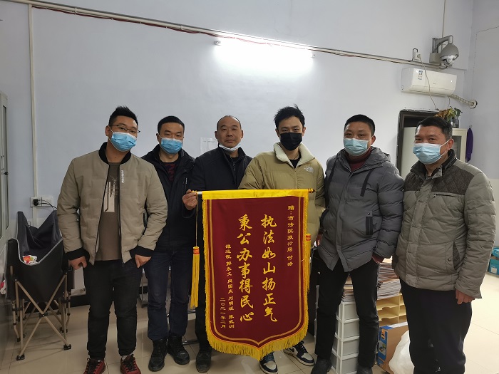近日,恩施市法院执行局成功执结5起追索劳动报酬纠纷案件,为民追回欠薪3万余元。为表感谢,工人们将写着“执法如山扬正气 秉公办事得民心”的锦旗赠予执行法官。这是一周里,市法院执行局第二次收到当事人赠送的锦旗。